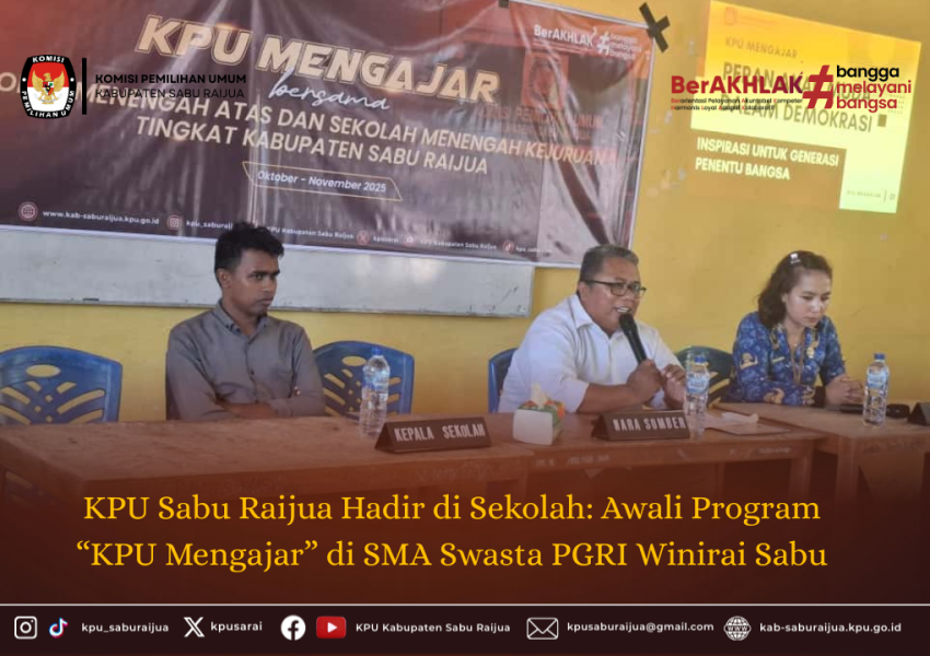 Sabu Raijua (17/10) KPU Kabupaten Sabu Raijua menggelar kegiatan perdana “KPU Mengajar” di SMA Swasta PGRI Winirai, sebagai bagian dari rangkaian pendidikan pemilih pemula “KPU Mengajar” di enam sekolah SMA/SMK sederajat se-Kabupaten Sabu Raijua.