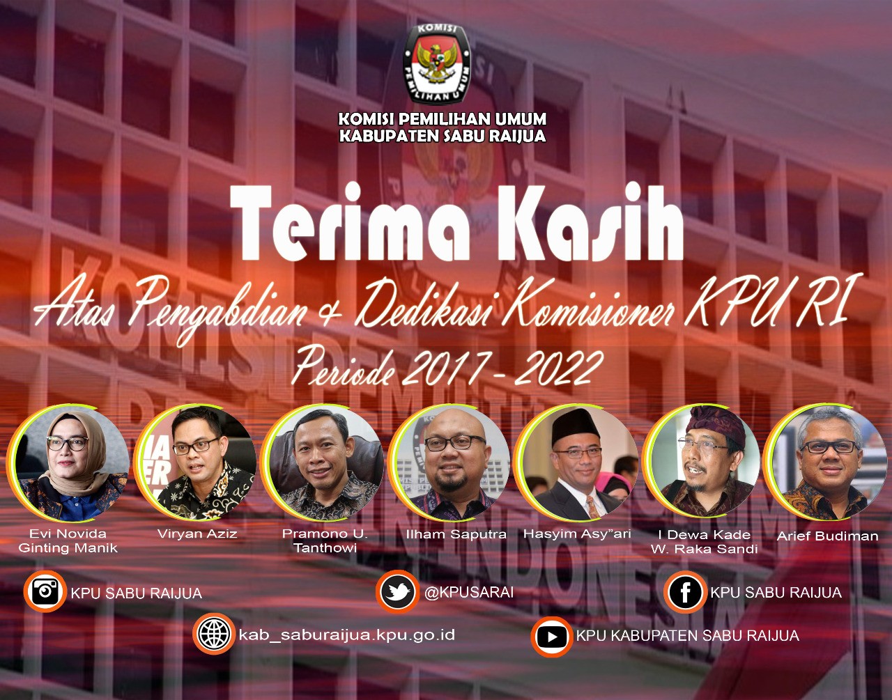 Dengan pelantikan terhadap tujuh orang Komisioner Komisi Pemilihan Umum Republik Indonesia periode 2022-2027 dan ditetapkannya Hasyim Asya'ri Sebagai Ketua Komisi Pemilihan Umum Republik Indonesia periode 2022-2027 ini tentunya akan tetap menjadi penyemangat dalam proses persiapan menuju tahapan 2024 sampai dengan pelaksanaannya, serta Ucapan terima kasih yang sangat besar diberikan kepada Ketua dan Anggota Komisi Pemilihan Umum Republik Indonesia periode 2017-2022 atas dedikasinya yang luar biasa.