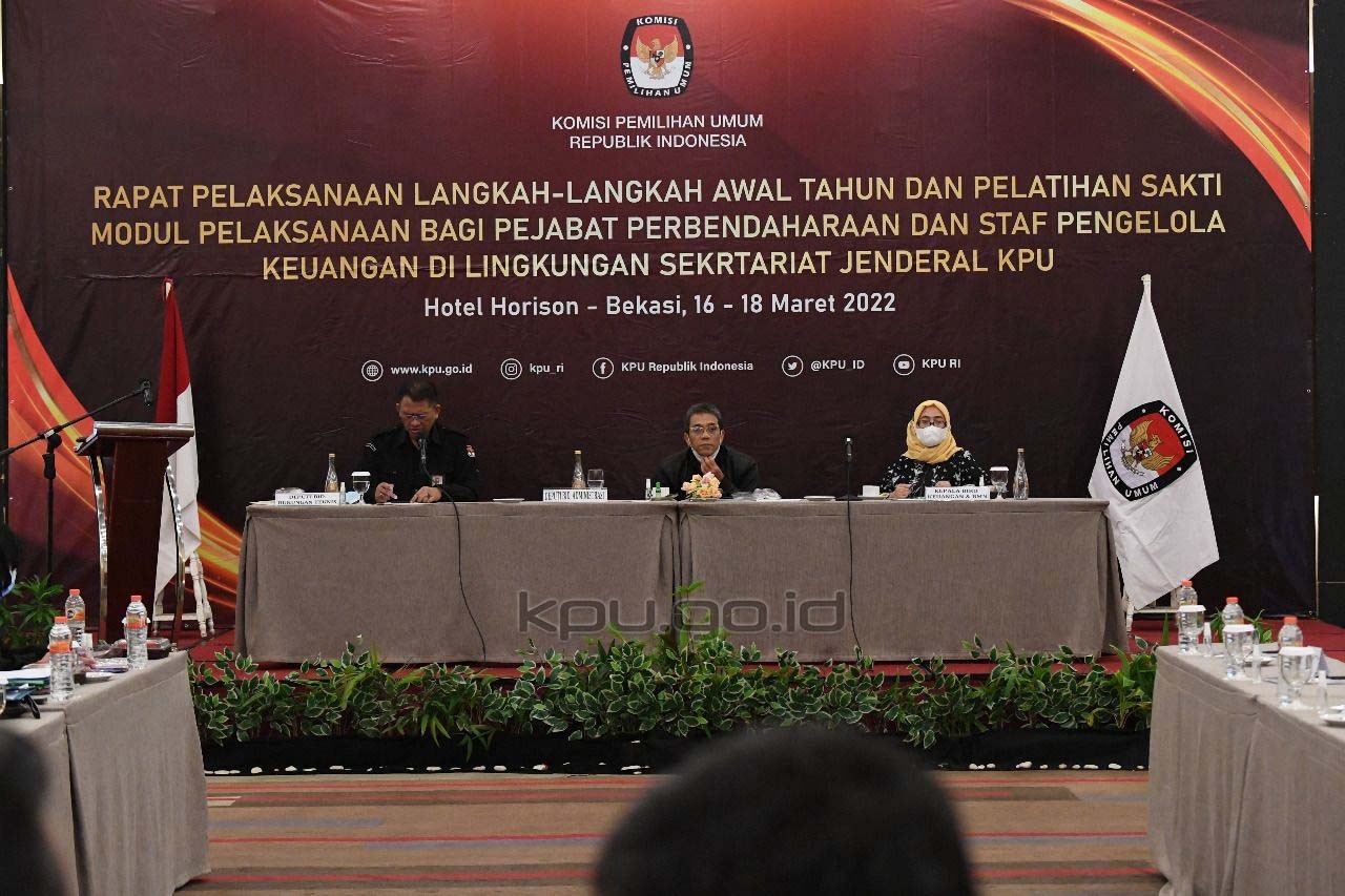 Bekasi, kpu.go.id - Komisi Pemilihan Umum (KPU) RI menggelar Rapat Pelaksanaan Langkah-langkah Awal Tahun dan Pelatihan SAKTI Modul Pelaksanaan bagi Pejabat Perbendaharaan dan Staf Pengelola Keuangan di Lingkungan Sekrtariat Jenderal KPU, selama 3 hari 16 s.d 18 Maret 2022 di Kota Bekasi, Jawa Barat.