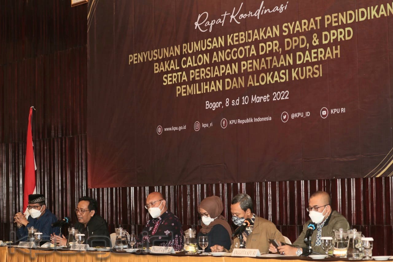 Bogor, kpu.go.id – Komisi Pemilihan Umum (KPU) RI menggelar Rapat Koordinasi (Rakor) Penyusunan Rumusan Kebijakan Syarat Pendidikan Bakal Calon Anggota DPR, DPD dan DPRD serta Persiapan Penataan Daerah Pemilihan dan Alokasi Kursi, 8-10 Maret 2022.