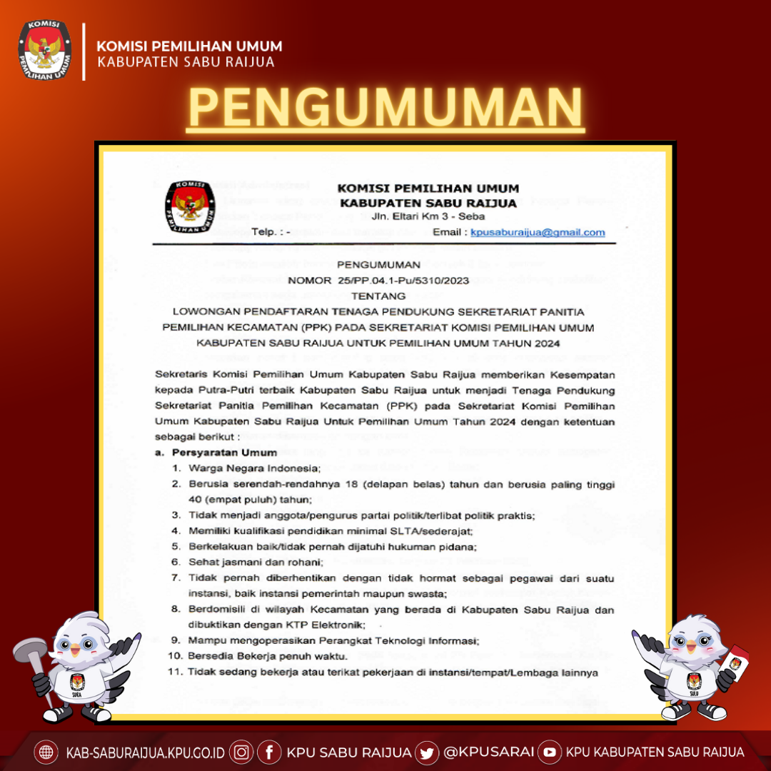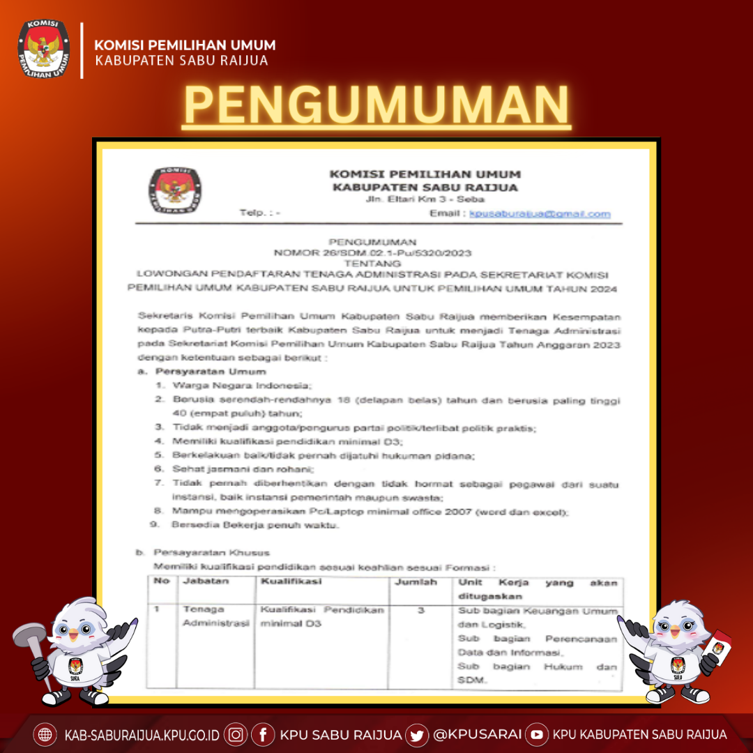 Lowongan Pendaftaran Tenaga Administrasi Pada Sekretariat Komisi Pemilihan Umum Kabupaten Sabu Raijua Untuk Pemilihan Umum Tahun 2024 Senin, 20 Februari 2023 00:00 745 Download Baca Selengkapnya
