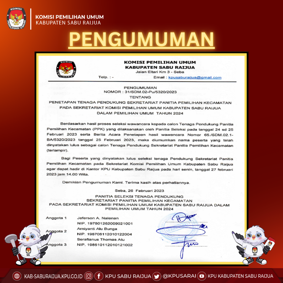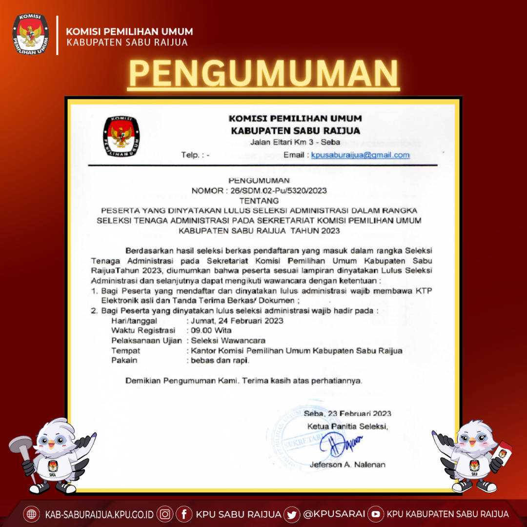 Pengumuman Seleksi Administrasi Untuk Posisi Tenaga Administrasi Pada Sekretariat KPU Kabupaten Sabu Raijua Kamis, 23 Februari 2023 00:00 837 Download Baca Selengkapnya