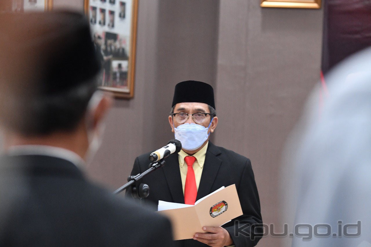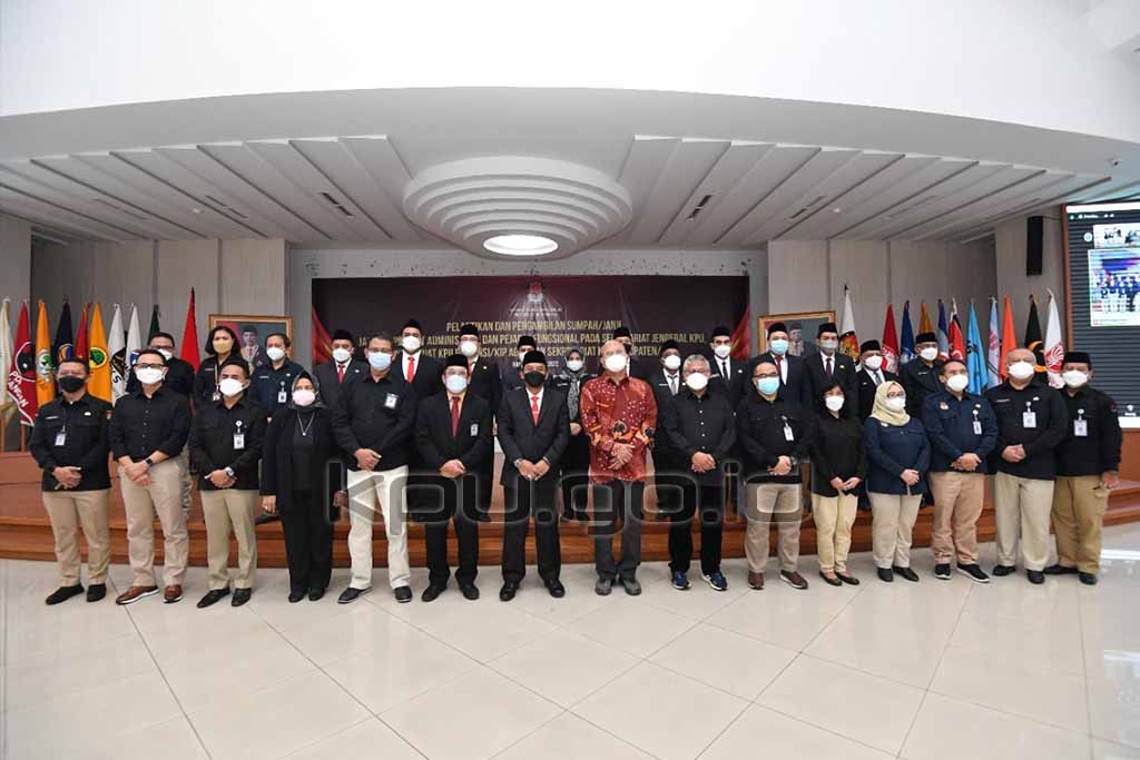Jakarta, kpu.go.id - Sekretaris Jenderal Komisi Pemilihan Umum (KPU) RI Bernad Dermawan Sutrisno melantik 190 pejabat administrasi, pejabat fungsional pada Sekretariat Jenderal KPU, Sekretariat KPU Provinsi/KIP Aceh dan Sekretariat KPU Kabupaten/Kota se-Indonesia, Rabu (5/1/2022). Ke-190 pejabat yang dilantik terdiri dari 118 sebagai Kepala Bagian (Kabag), 61 pejabat dilantik sebagai sekretaris, 5 pejabat administrasi, dan 6 pejabat pengawas. Seluruh pejabat yang dilantik baik yang hadir secara luring dan daring mengucap sumpah dan janji yang dipimpin oleh Sekjen KPU RI. Dalam arahannya, Bernad menyampaikan bahwa pelantikan ini berdasarkan Keputusan KPU RI Nomor 12-15/SDM.05.5/04/2022 tanggal 4 Januari 2022. Selain itu pelantikan juga bagian dari implementasi PKPU 14 tahun 2020 tentang Tugas, Fungsi, Susunan Organisasi dan Tata Kerja (SOTK), terutama di tingkat sekretariat KPU Provinsi dan Kabupaten/Kota. "Jadi hari ini momentum yang baik sehingga ini mengingatkan kita semua bahwa implementasi PKPU 14 sudah dimulai dari pusat dan sekarang sudah masuk ke Provinsi, dan Kab/Kota," ucap Bernad. Bernad pun menyampaikan arahannya kepada masing-masing pejabat yang baru dilantik sebagai kepala bagian untuk bekerja menggunakan SOTK menyesuaikan diri dengan ritme ekosistem kerja yang baru sesuai PKPU 14. Bagi pejabat yang dilantik menjadi pejabat fungsional tata kelola pemilu ditingkat provinsi, dia berpesan agar menjalankan tugas dengan baik. Sementara itu, bagi fungsional madya tata kelola pemilu di provinsi agar dapat mengikuti ritme dan menyesuaikan pola kerja fungsional. Untuk para sekretaris yang dilantik, Bernad mengarahkan agar melakukan empat hal. Pertama, sekretaris agar melaporkan diri kepada Ketua dan Anggota KPU Kab/Kota masing-masing. Kedua, segera melakukan konsultasi anggaran kepada sekretaris KPU Provinsi masing-masing dan konsultasi program kegiatan pada masing-masing pleno Kab/Kota. Kemudian, para sekretaris juga diminta segera melakukan konsolidasi dengan kesekretariatan KPU Kab/Kota. Terakhir, Bernad mengatakan para sekretaris agar melakukan koordinasi dengan stakeholder. Menutup arahannya, Bernad mengucapkan selamat bagi para pejabat yang dilantik. Senada, Ketua KPU RI Ilham Saputra juga memberi ucapan selamat bagi para pejabat yang dilantik. Menurutnya, amanah yang diberikan kepada para pejabat ini tidak bisa dianggap enteng karena merupakan amanah yang besar dan dilantik atas nama Tuhan. Ilham juga meminta agar para pejabat yang dilantik membangun komunikasi yang baik dengan komisioner dan membangun kondusivitas di lingkungan kerja demi menyukseskan Pemilu dan Pemilihan 2024. "Membangun lingkungan kerja yang baik juga penting," ujar Ilham. Turut hadir, Ketua KPU RI Ilham Saputra, Anggota KPU RI Arief Budiman, Deputi Bidang Dukungan Teknis Eberta Kawima, Deputi Bidang Administrasi Purwoto Ruslan Hidayat, Inspektur Utama Nanang Priyatna dan para pejabat Eselon II Sekretariat Jenderal KPU RI serta jajaran KPU Provinsi/KIP Aceh dan KPU/KIP Kab/Kota Se-Indonesia. (humas kpu ri tenri/ foto: dosen/ed diR)