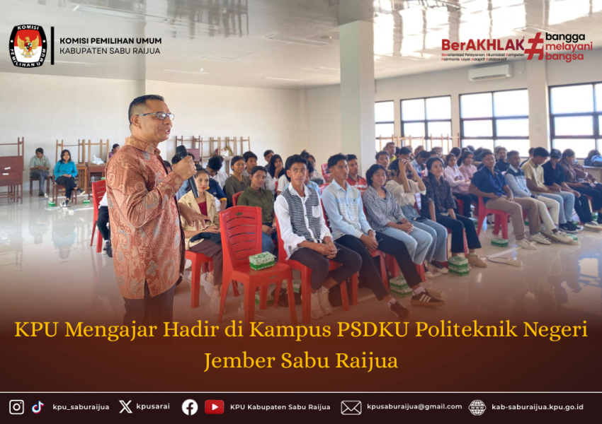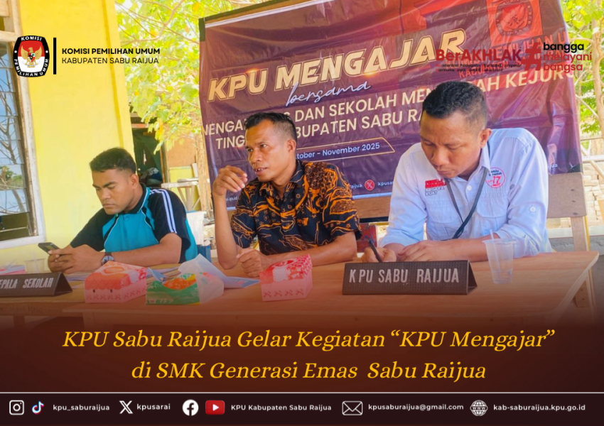 Kamis (30/10). Komisi Pemilihan Umum (KPU) Kabupaten Sabu Raijua kembali melanjutkan program “KPU Mengajar”, kali ini di SMK Generasi Emas Sabu Raijua, Kegiatan ini merupakan bagian dari agenda pendidikan pemilih bagi pemilih pemula, yang bertujuan meningkatkan pemahaman generasi muda tentang proses demokrasi dan pentingnya partisipasi dalam pemilu. Kegiatan dibuka dengan sambutan oleh Lodewick Kitu, selaku Kadiv Rendatin KPU Kabupaten Sabu Raijua, yang sekaligus bertindak sebagai narasumber. Dalam arahannya, Lodewick kitu menekankan bahwa kegiatan ini merupakan sarana bagi KPU untuk mendekatkan diri dengan peserta didik, sekaligus memberikan edukasi tentang sistem dan tahapan pemilu. Dalam sesi materi, dari KPU menyampaikan sejumlah topik penting antara lain tentang Bagaimana menjadi Pemilih, siapa saja yang terdaftar sebagai pemilih, bagaimana mekanisme agar bisa terdaftar sebagai pemilih dan cara mengetahui apakah sudah terdaftar sebagai pemilih atau belum, . Terakhir KPU juga berpesan .agar “para siswa yang sudah memenuhi kriteria sebagai pemilih untuk bisa mengecek dan memastikan nama adik adik semua telah terdaftar di DPT” Kegiatan berlangsung interaktif dengan sesi tanya jawab yang dipandu oleh Serafianus T. Atu, selaku Kasubag Rendatin KPU Kabupaten Sabu Raijua, yang bertindak sebagai moderator. Antusiasme para siswa terlihat dari banyaknya pertanyaan seputar proses pemilu dan cara menggunakan hak pilih dengan benar. Melalui program KPU Mengajar, KPU Kabupaten Sabu Raijua berharap semakin banyak generasi muda yang memahami nilai-nilai demokrasi, serta menjadi pemilih cerdas dan berintegritas dalam setiap penyelenggaraan pemilu.